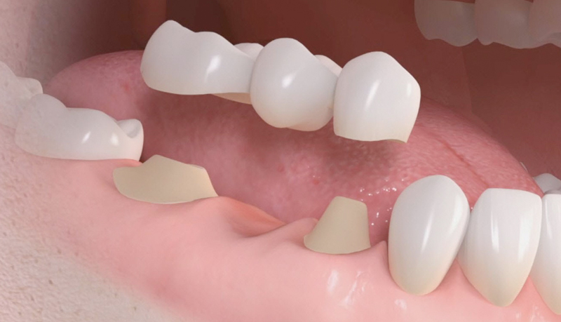 Opción para la sustitución de los dientes que faltan usando como pilares los dientes adyacentes a la brecha que previamente han de ser preparados y tallados, sobre los cuales podemos colocar puentes confeccionados en diversos materiales: metal-porcelana, solo porcelana(casos muy estéticos), y de circonio-porcelana( alta resistencia y estética)